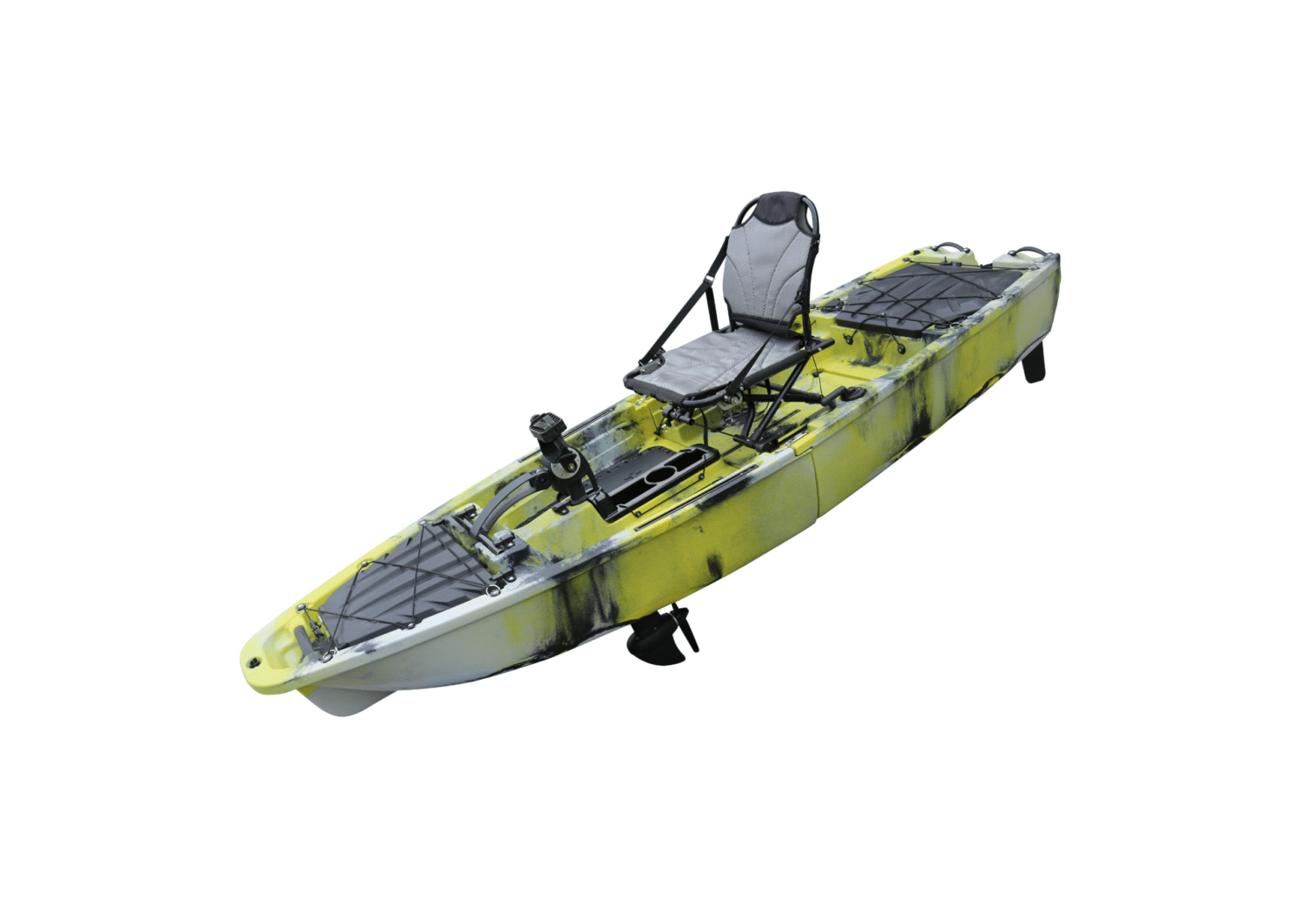 | Equipements inclus | Pagaie : 1 paire Assise : 1 siège réglable 3 positions en hauteur et inclinable Pédalier : 1 pédalier à hélice marche avant et marche arrière Repose canne : 1 repose canne Accastillage : coffre avant et arrière, filet tendeur, poignées de transport, rangement étanche, emplacement batterie. Rangement canne : 2 tubes incrustés dans le kayak |